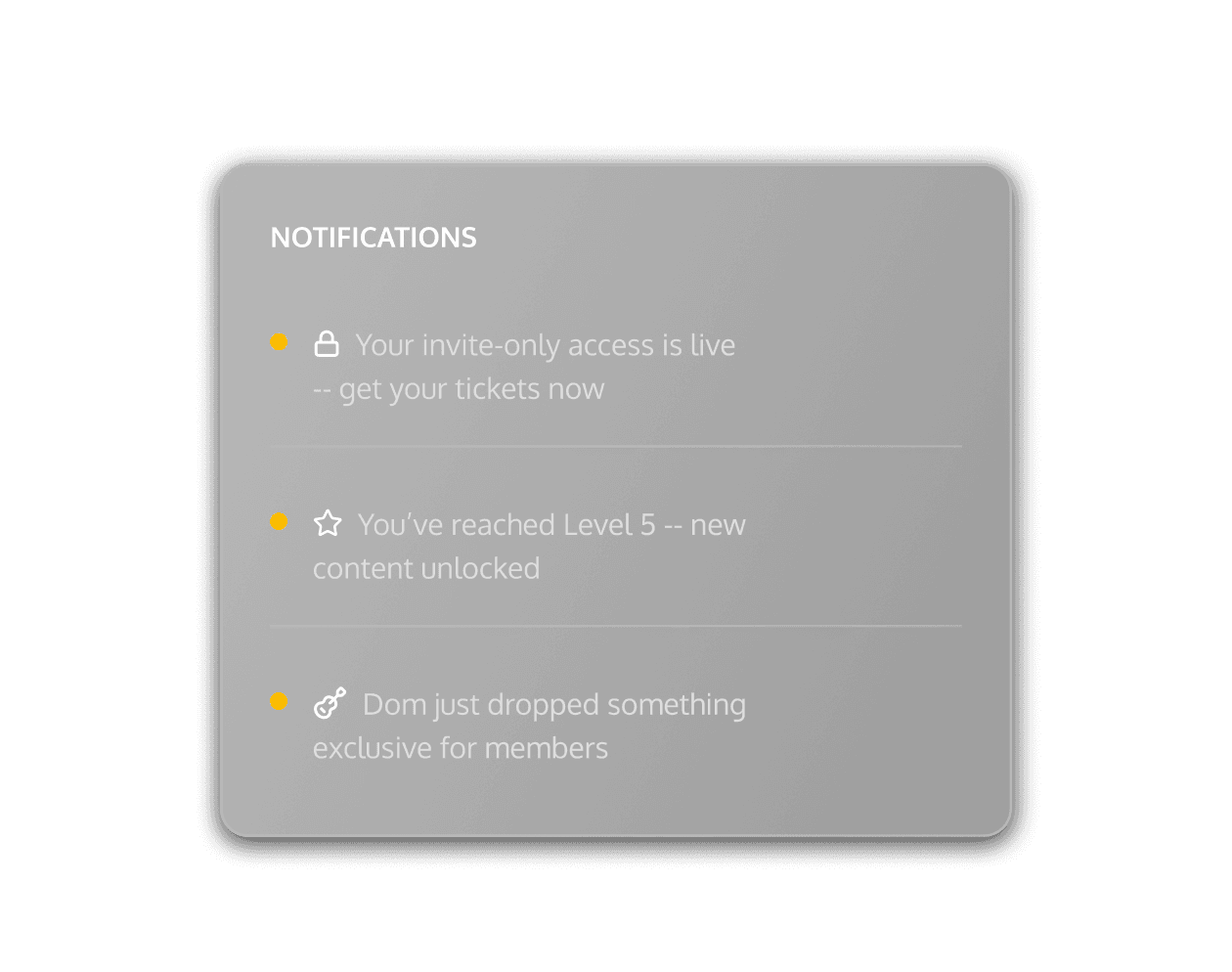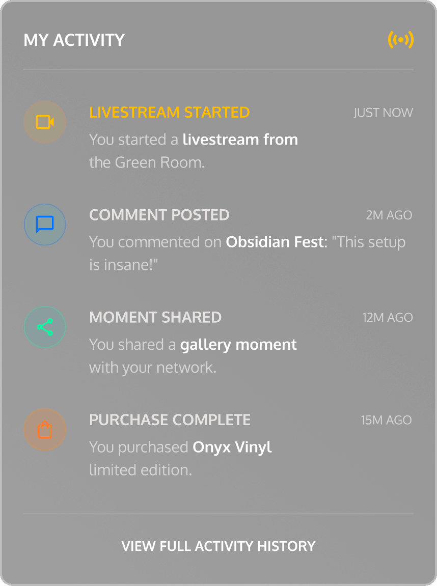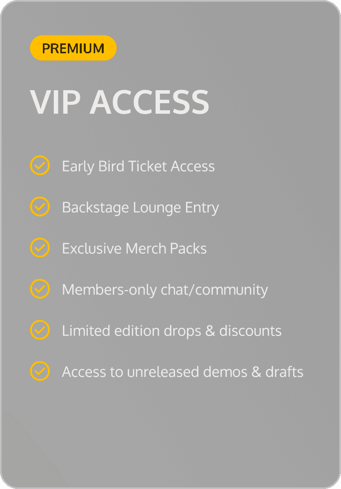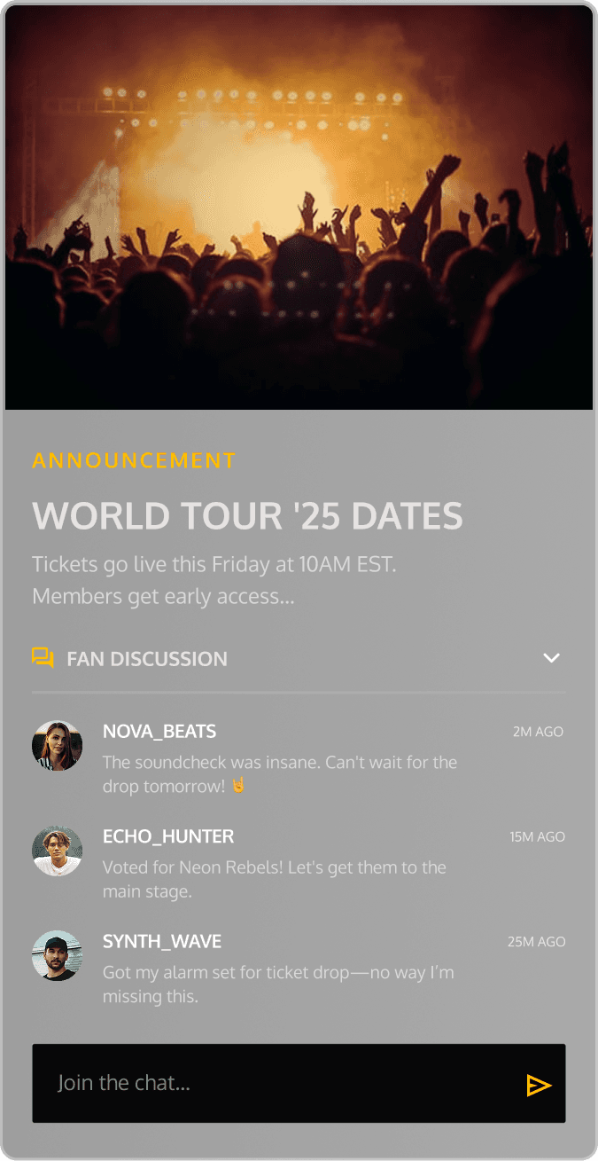 A fully custom fan membership world where Dom’s biggest fans earn their place. Entry is invite-only. Fan data determines who gets first access. Buying tickets, checking in, and interacting all build a visible timeline that unlocks new rewards and deeper access over time.