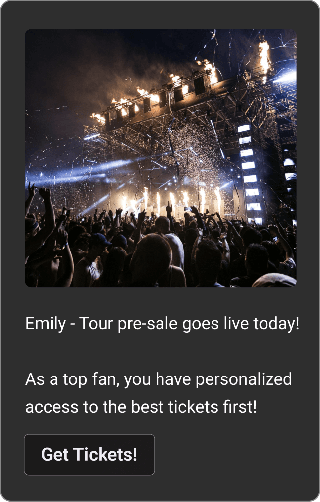 Give your top fans first access to tickets, offers, merch, and more through robust integrations to make every fan feel valued & unlock the full potential of your fanbase.